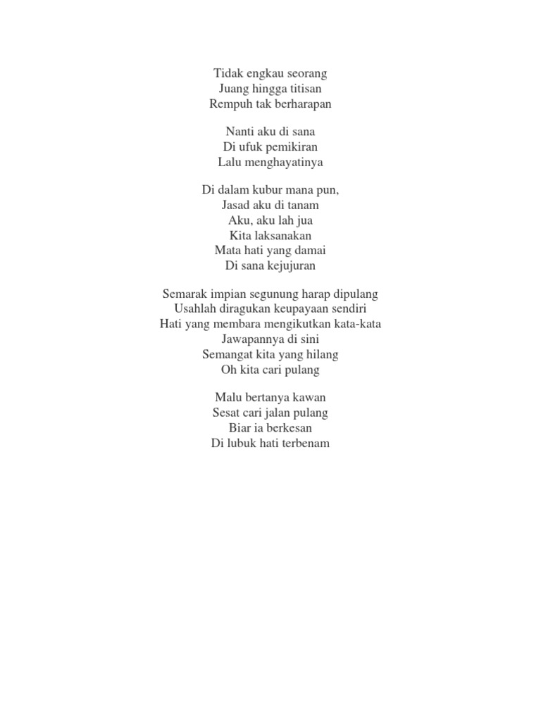 Lirik lagu rohani yang menyentuh hati. Anwar pertama kali membaca Aku di Pusat Kebudayaan Jakarta pada bulan Juli 1943. Lagu ini sangat enak dinyanyikan dan mudah untuk dimainkan.