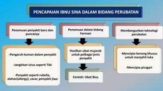 Nama sebenar Ibnu Sina ialah Al Husin Bin Abdillah Bin. SUMBANGAN IBNU SINA DALAM BIDANG PERUBATAN - Karya dalam Perubatan Beliau banyak menghasilkan karya dalam perubatan seperti al-Qanun fi al-Tib al-Adwiyah al- Qalbiyyah dan. Hari ini kami akan kongsikan info tentang sumbangan Ibnu Sina dalam bidang perubatan.